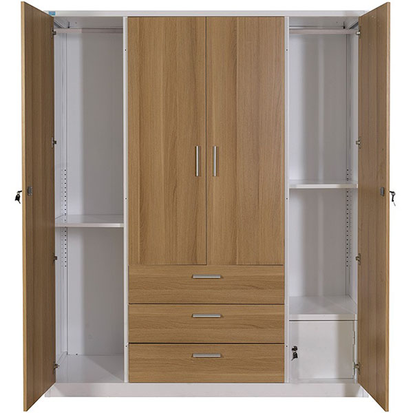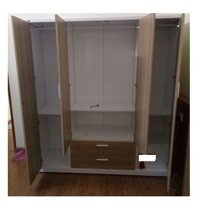 cánh gỗ công nghiệp phủ Melamine. Tủ gồm 4 cánh mở và 2 ngăn kéo. Bên trong mỗi khoang cánh mở có 1 đợt di động và 1 suốt treo quần áo. Khoang cánh mở ngoài cùng bên phải có thêm 1 ngăn để đồ